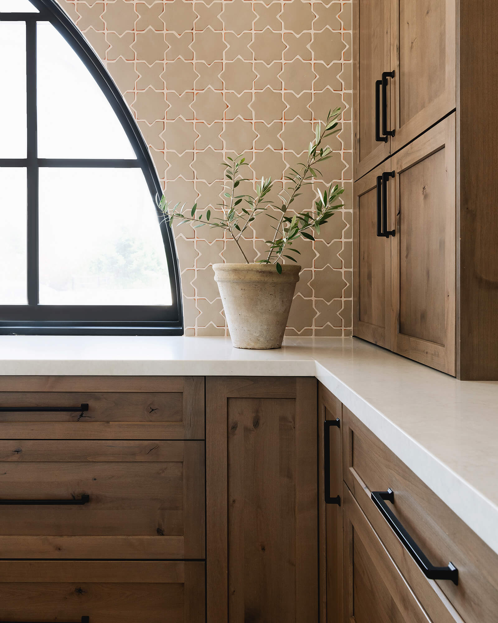 This kitchen design features Dura Supreme Cabinetry’s Hudson door style in the luxurious “Cashew” stained finish on Knotty Alder with accents in the “Putty” paint. Kitchen design by Honeycomb Home Design of Arroyo Grande, California. Photo by Lisa Maksoudian.