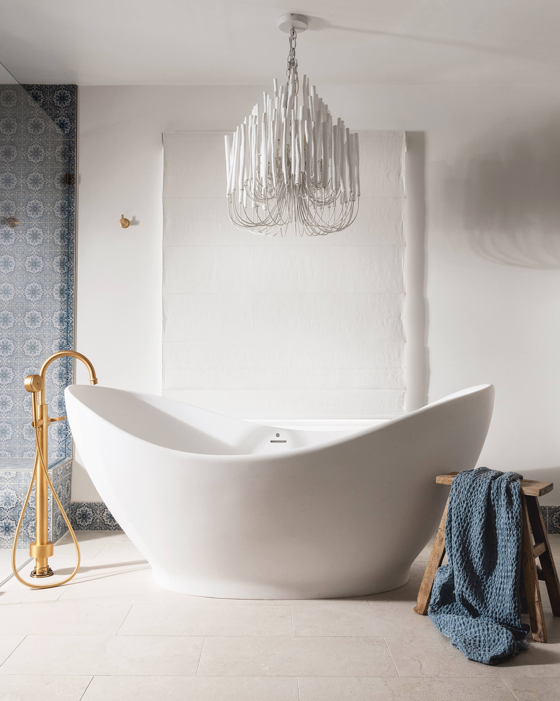 A close up of luxury brass bath tub faucet and hardware in a high-end bathroom design.