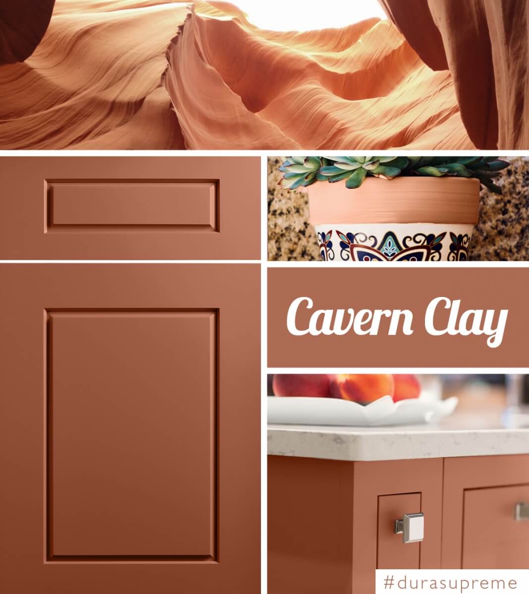 A peachy, coral, cavern clay custom painted kitchen island cabinet created with Dura Supreme's simplified and affordable Personal Paint Match program.