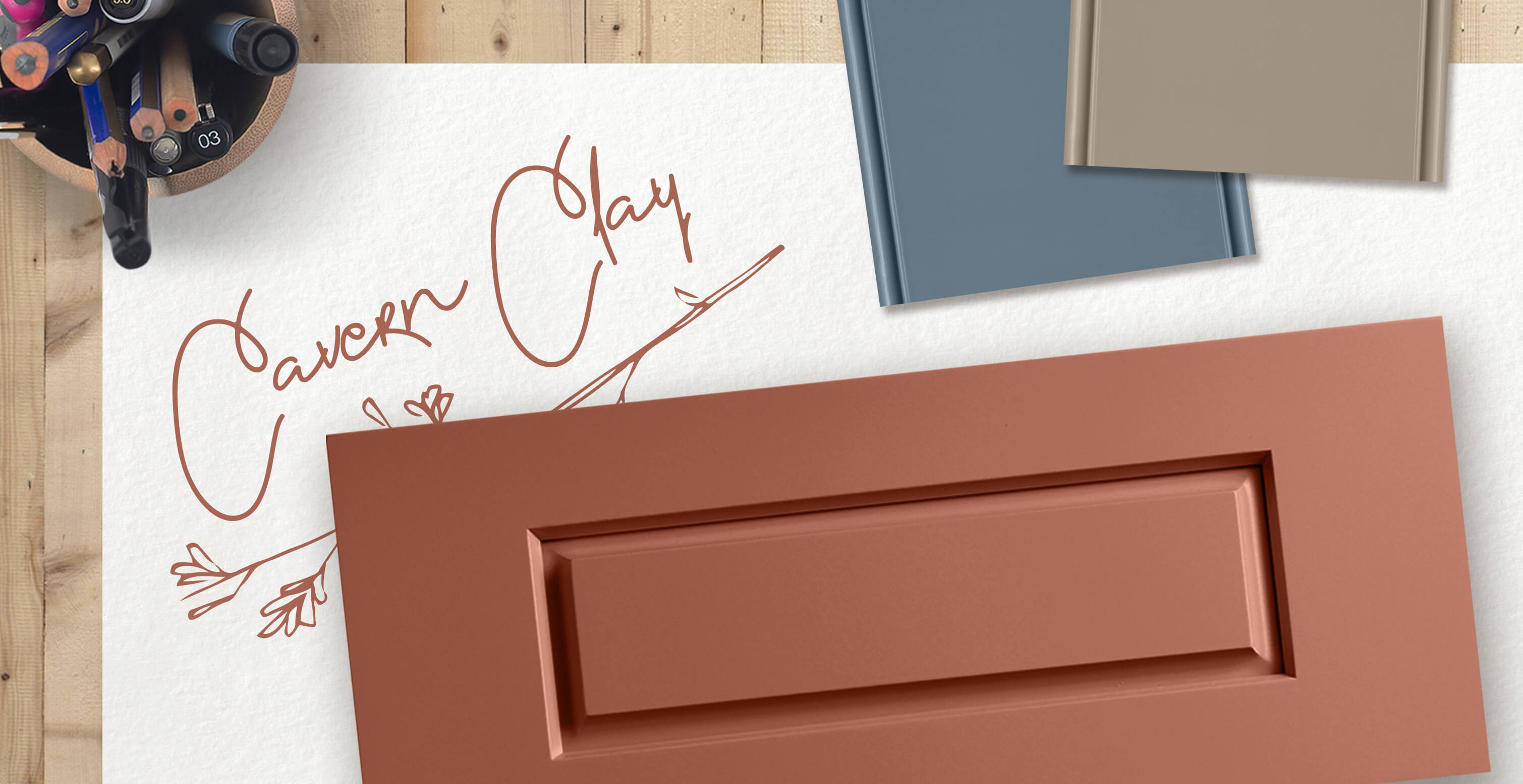 Dura Supreme’s Chelsea door style with a Personal Paint Match Finish in Cavern Clay SW 7701. Color chip samples are shown in Distance SW 6243 and Moth Wing SW 9174.