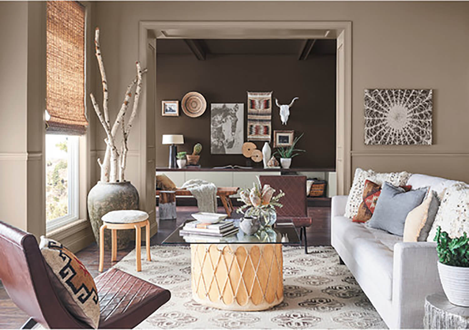 It’s no wonder Cavern Clay was selected for this coming year. It pairs stunningly with simplistic woodgrains, leather furnishings, stone elements, worldly textiles, and sun-washed hues. It’s also dramatically eye-catching against today’s popular white finishes and decor.
