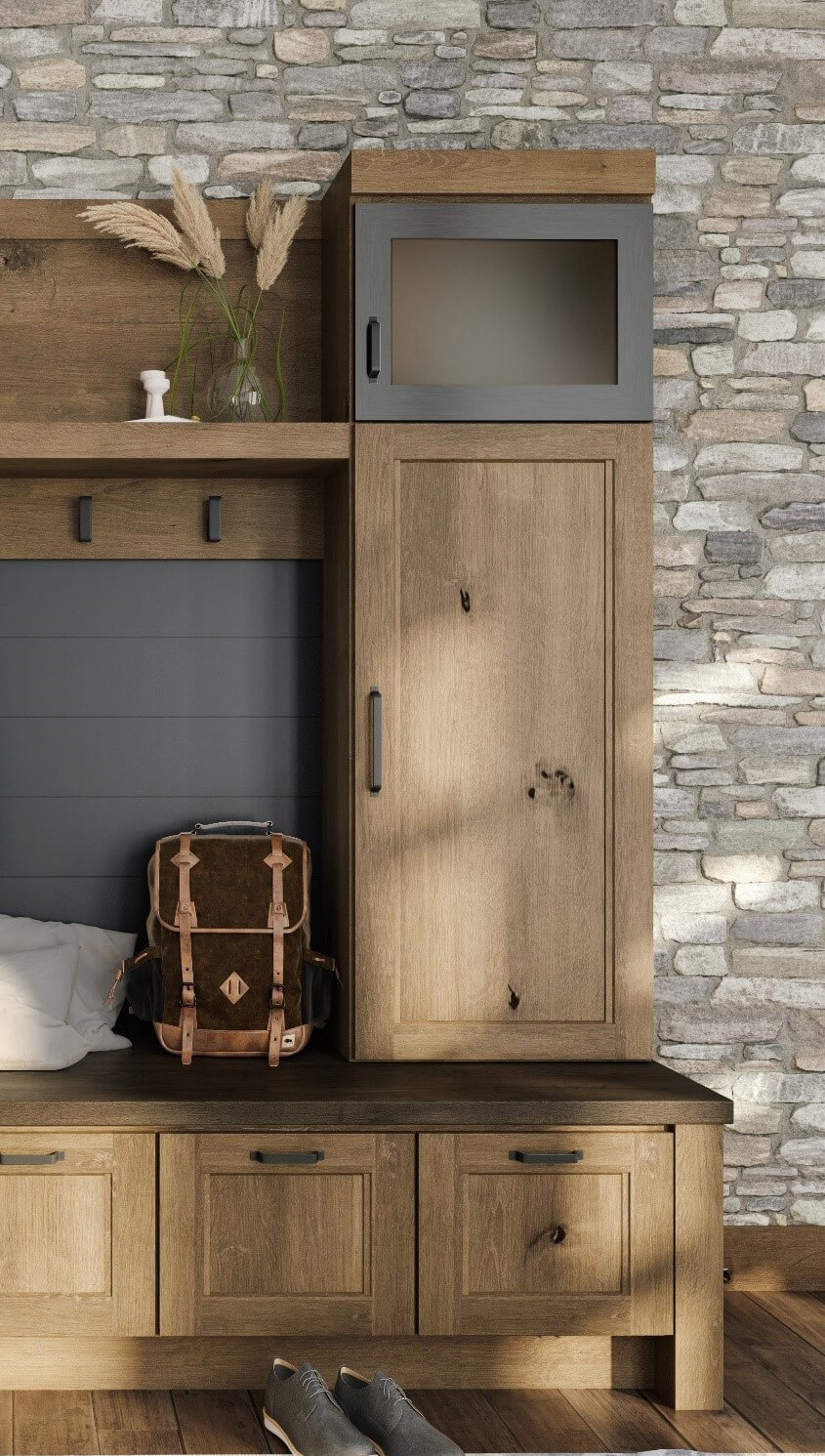 Dura Supreme’s shiplap panel finished in the Curated Color “Software” paired with a boot bench/locker in Knotty Alder with a Heather low-sheen stain on the Avery door style