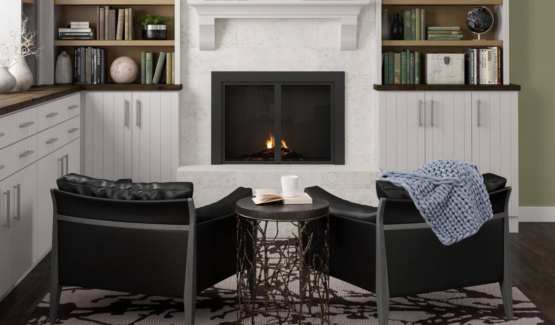 We’ve all seen fireplace walls done in shiplap. The below fireplace shows off a beautiful encaustic tile while using shiplap-inspired cabinetry.