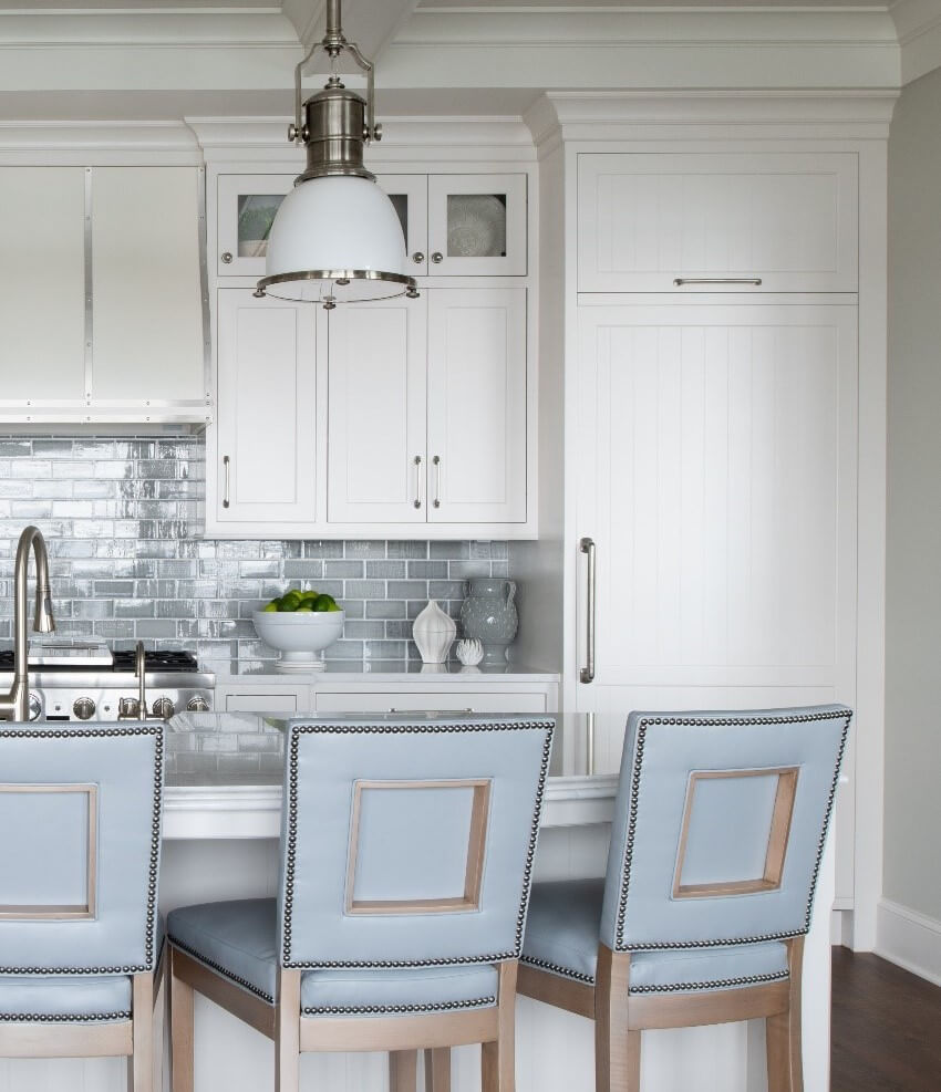 Dura Supreme’s Linea door style in Pearl paint, paired with Maple in Cashew stain/ pale green glass tile.