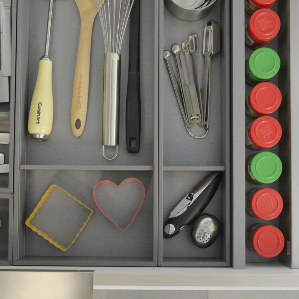 If your drawer space is limited, or if you’re not quite willing to dedicate an entire drawer to your spice collection try a multi-purpose drawer. There are countless ways to customize your drawers so they serve multiple purposes. Combine a spice rack drawer accessory with any other drawer accessory, partitions, or dividers to create storage unique to your style of cooking.