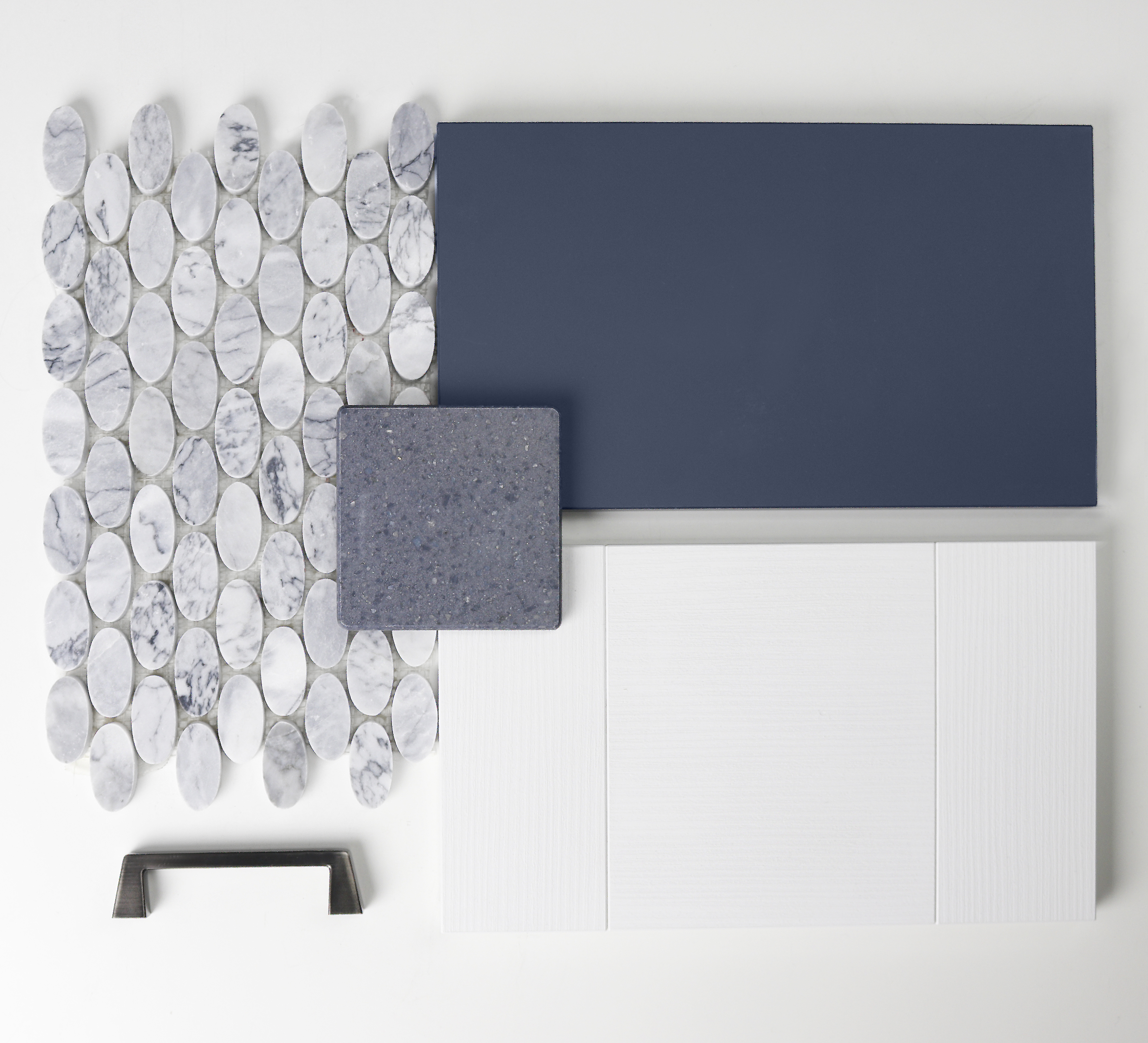 In addition to whites and natural wood textures, blues have always had a home in coastal design. Here is a perfect selection showing just that. This is our Allura door style in Matte Navy, and our Dash door style in Carrara White. The tile selection masterfully pulls together the blues and whites.