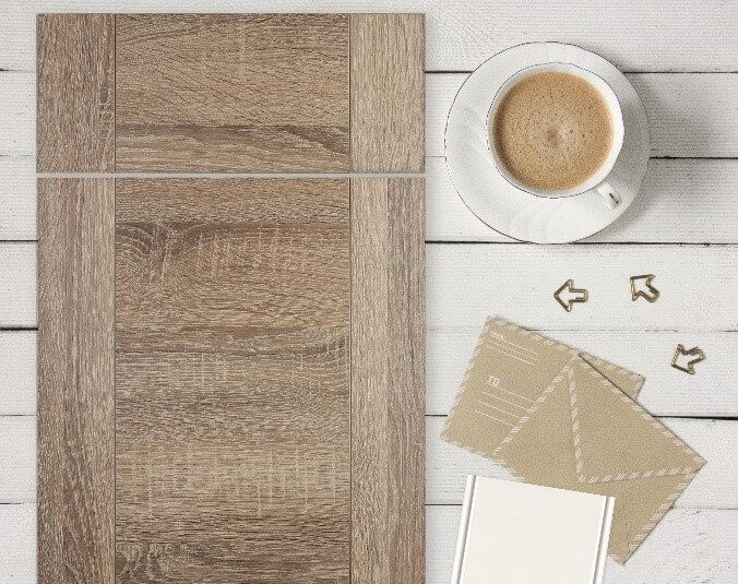 Dura Supreme also recently launched a new Textured TFL cabinets, which lends itself well to this style. Below we see our Dash door style in Lodge Oak Textured TFL, giving the look of weathered wood. A playful, tri-panel cabinet door with just the right amount of dimension and wood grain, ready to pair with whites, blues, or greens.