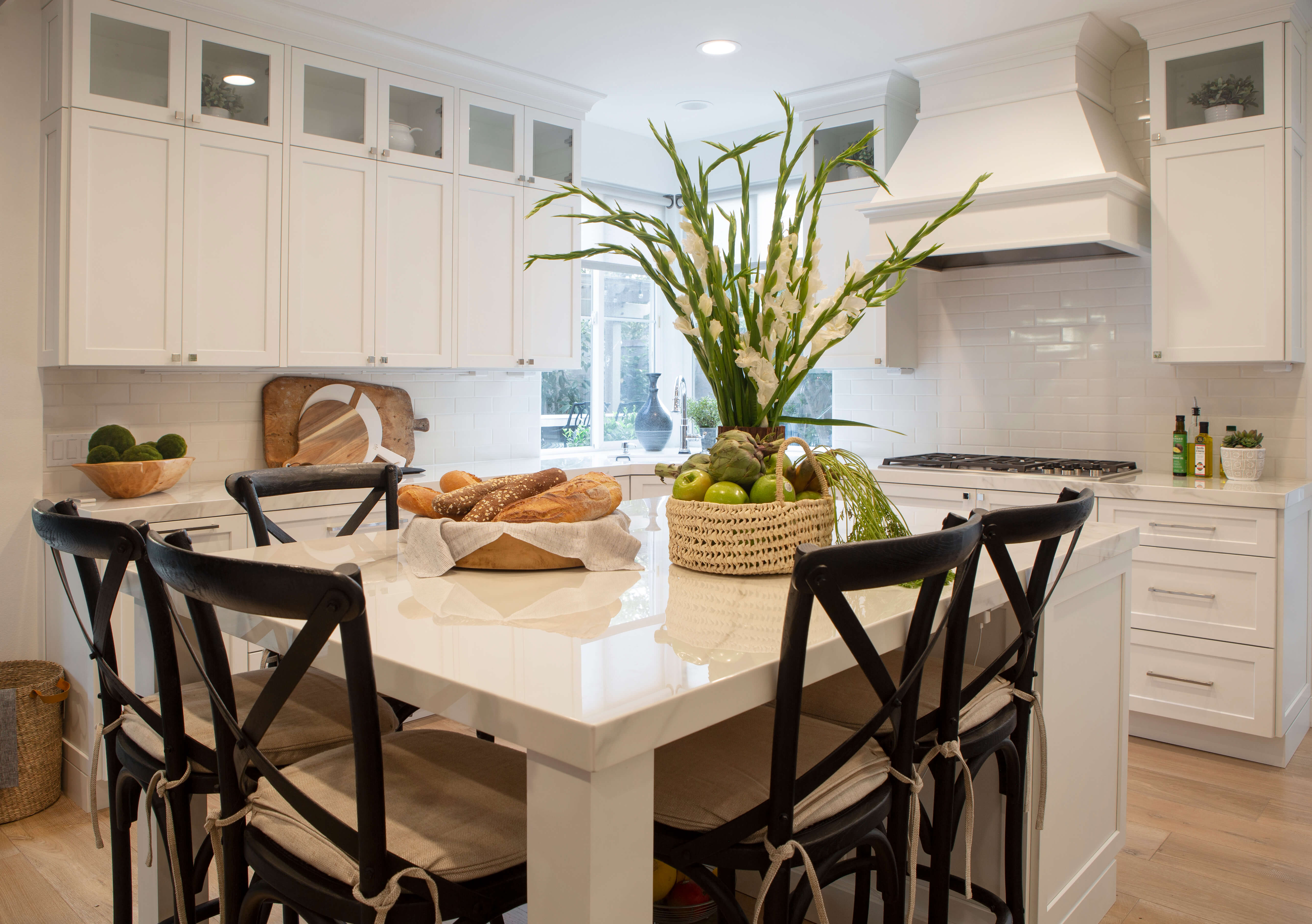 This cozy kitchen offers an eat-in kitchen island table with a square shape and beautiful furniture detailing.