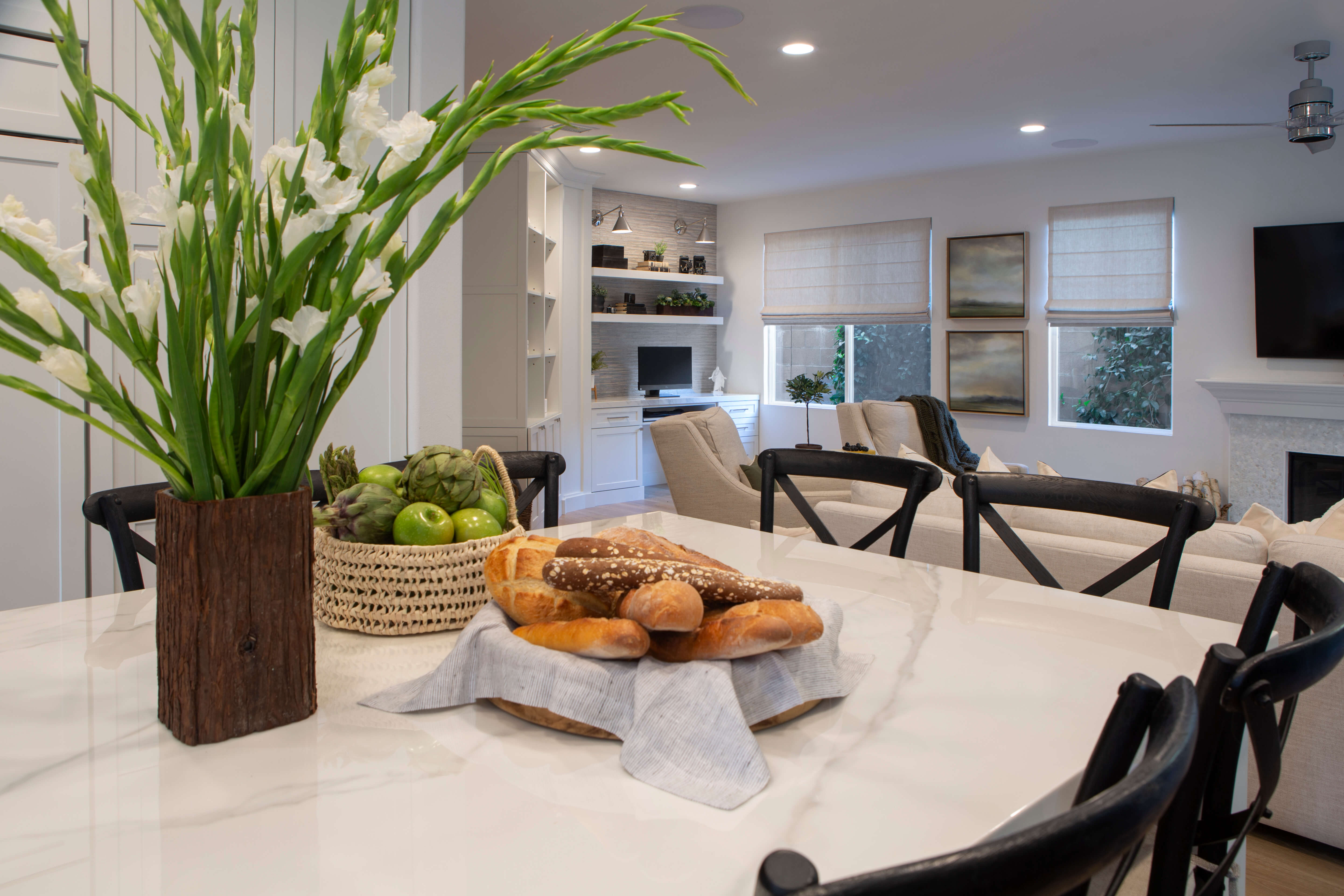 The photos below are another great example of enlarging the kitchen space and using the kitchen island for table seating adjacent to the living room.