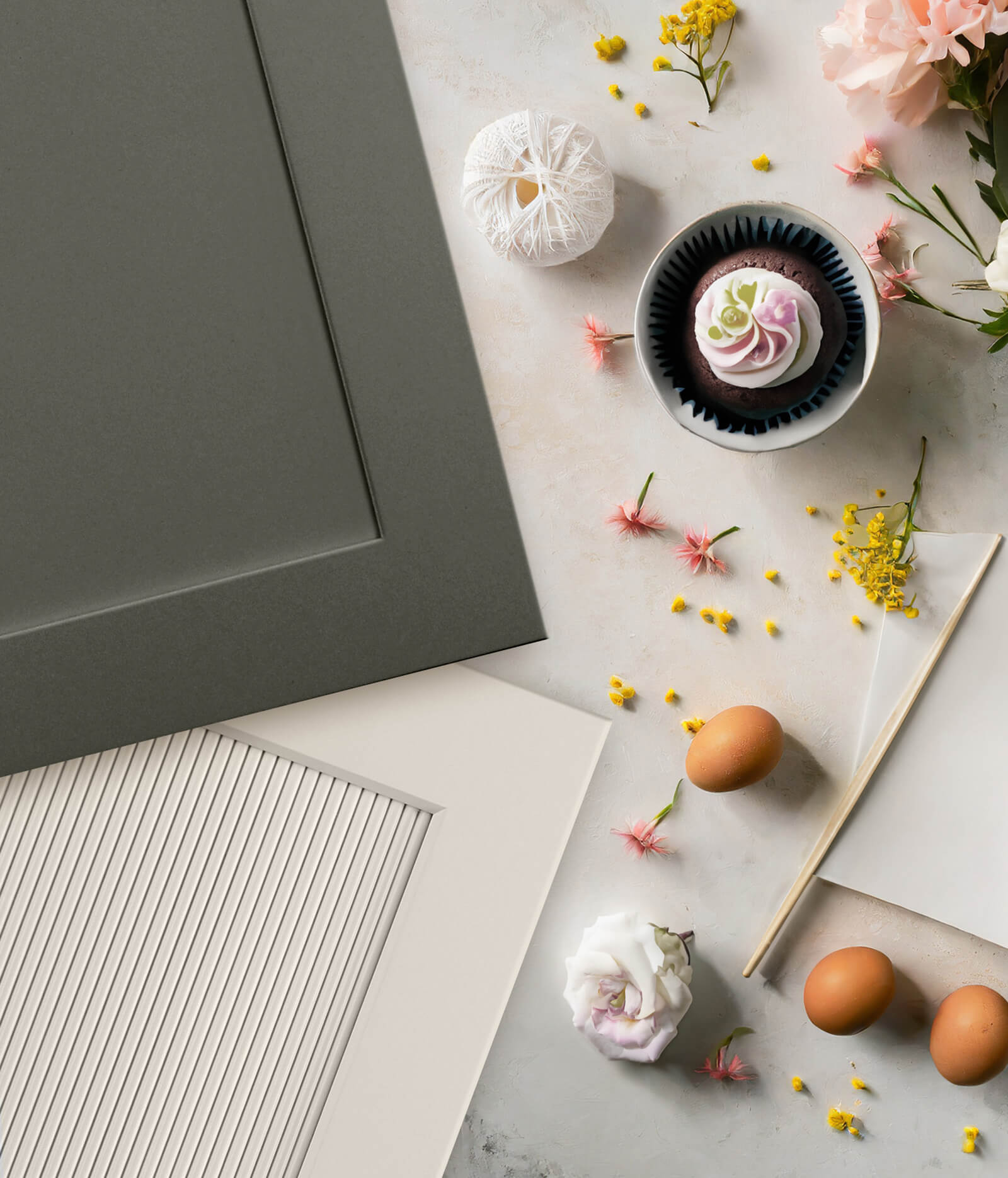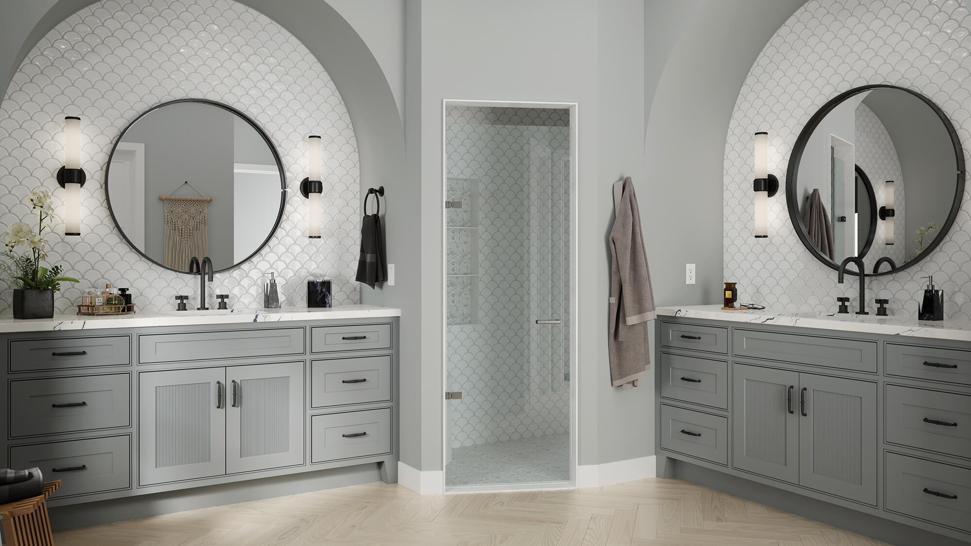 This mood board features Dura Supreme’s Paris door style with a Reeded Panel Insert in the “Putty” paint finish paried with the Paris door style in “Cast Iron” paint.