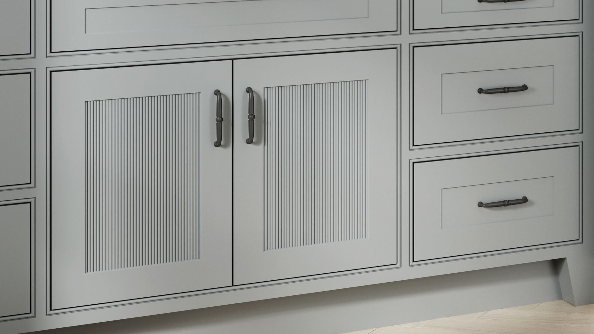 A gray painted vanity with reeded cabinets.
