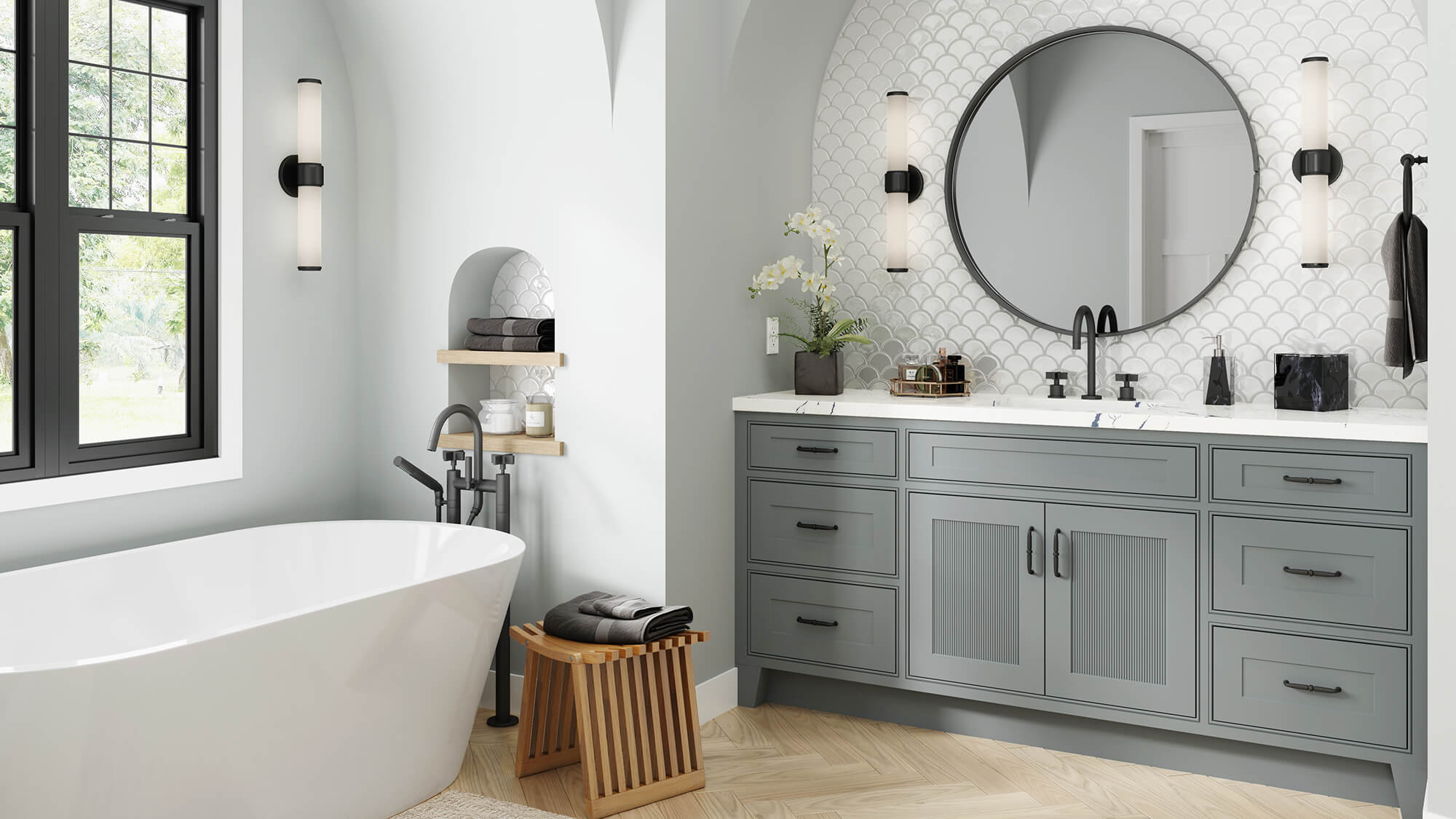 This bathroom features Dura Supreme’s Parker Inset door style accented with reeded panels in the  “Software” paint in our Curated Color Collection