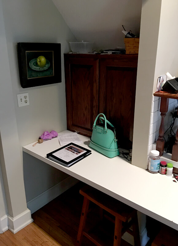 Their well used KitchenAid mixer has a happy home in an appliance lift cabinet next door to the baking center’s prep space.