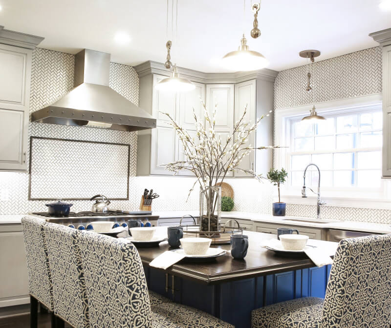 The unique blue color of the kitchen island was selected with the inspiration of the family’s treasured dishware from the Czech Republic.