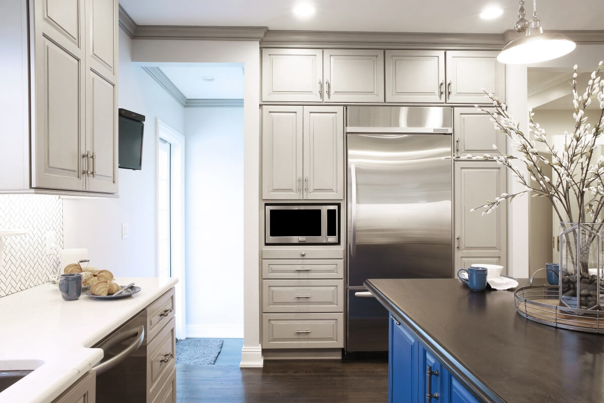 The kitchen island is shown in a custom blue artisan finish by Dura Supreme Cabinetry.