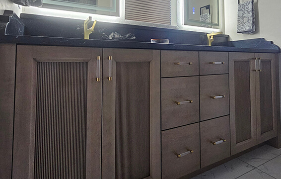 I would love to give a huge shout out to my designer, Rick Kellar with Designer Wood Finishes in Grand Junction, Colorado. I went in to his showroom, which is gorgeous by the way, and I went in with high hopes but a low single mom budget! He showed me the reeded door with Dura Supreme on his vanity display in his showroom, and I instantly fell in love, but of course it was not budget friendly for my status! I picked out some ideas that would still make me happy, and then got overwhelmed. Rick took it upon himself to put together a design in his Dura Supreme design program and show it to me with a less-priced option. Then, when he was installing my cabinets, he called me over to the house and asked me to open the boxes for him to see what he came up with for my design. To my surprise, he surprised me with the reeded door for my custom bathroom vanity!! I had absolute huge tears in my eyes and could never thank him enough for what he did! He deserves kudos for an outstanding design and HUGE surprise!! I show this Dura Supreme design for ALL TO SEE!!